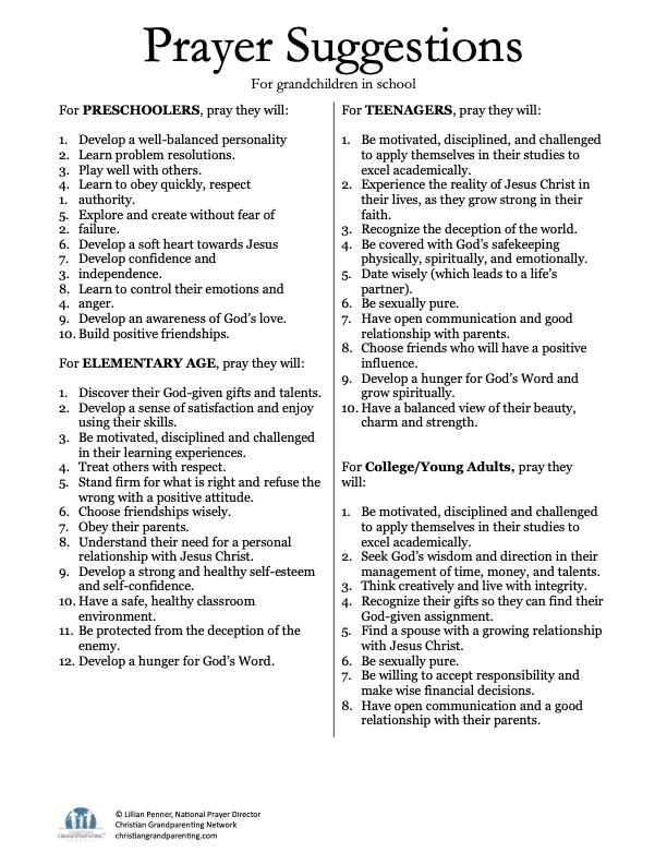 Whether they are in public, private, or home school, our grandchildren are facing things we never dreamed of at their age. From pre-school to college, this prayer guide will help you to pray more specifically for your grandchildren at various stages in their school experience.