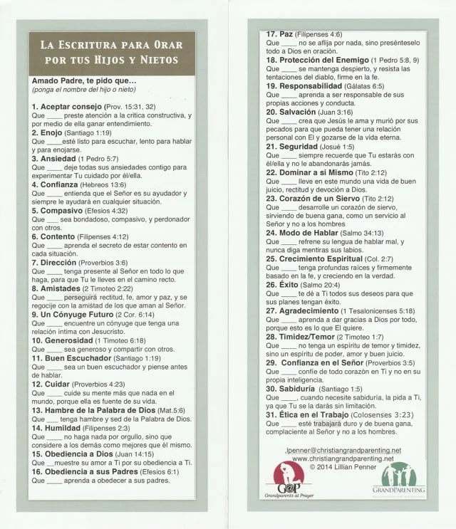 Hay muchos beneficios al orar las Escrituras. Entre ellos se encuentran una atención más enfocada durante la oración y contenido específico para sus oraciones. “31 Escrituras para orar” para sus nietos contiene 31 indicaciones de oración basadas en las Escrituras para ayudar a los abuelos a orar las Escrituras.