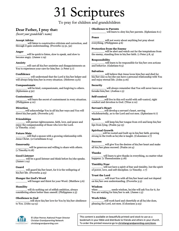 There are many benefits to praying Scripture. Among them are more focused attention during prayer and specific content for your prayers. “31 Scriptures to Pray” for your grandchildren contains 31 Scripture-based prayer prompts to help grandparents pray Scripture.