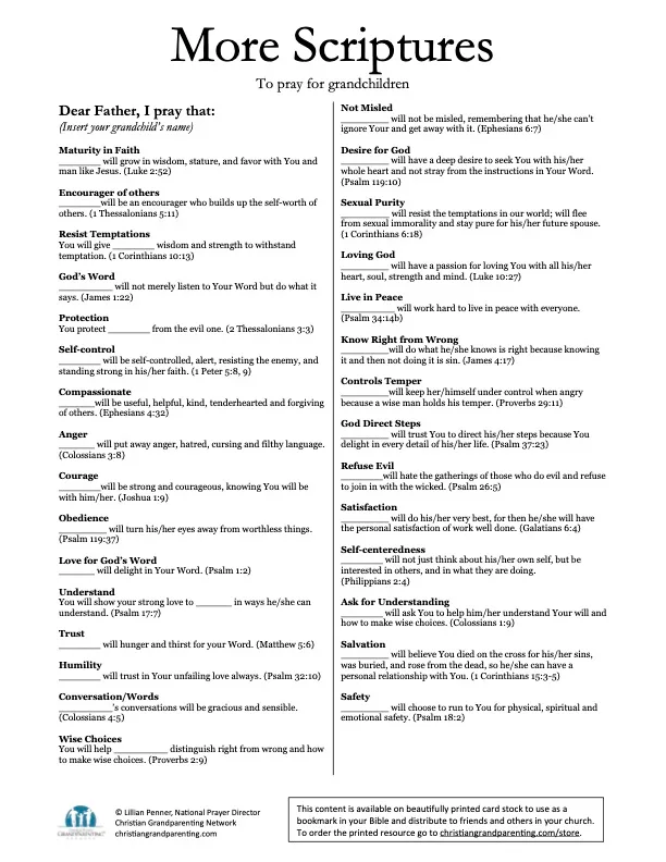 When we pray Scripture, we never need to question the content of our prayers. As well, praying Scripture is a powerful way to pray God’s will for our grandchildren. “More Scriptures to Pray” goes beyond “31 Scriptures to Pray” providing grandparents with 30 additional Scripture-based prayer prompts.