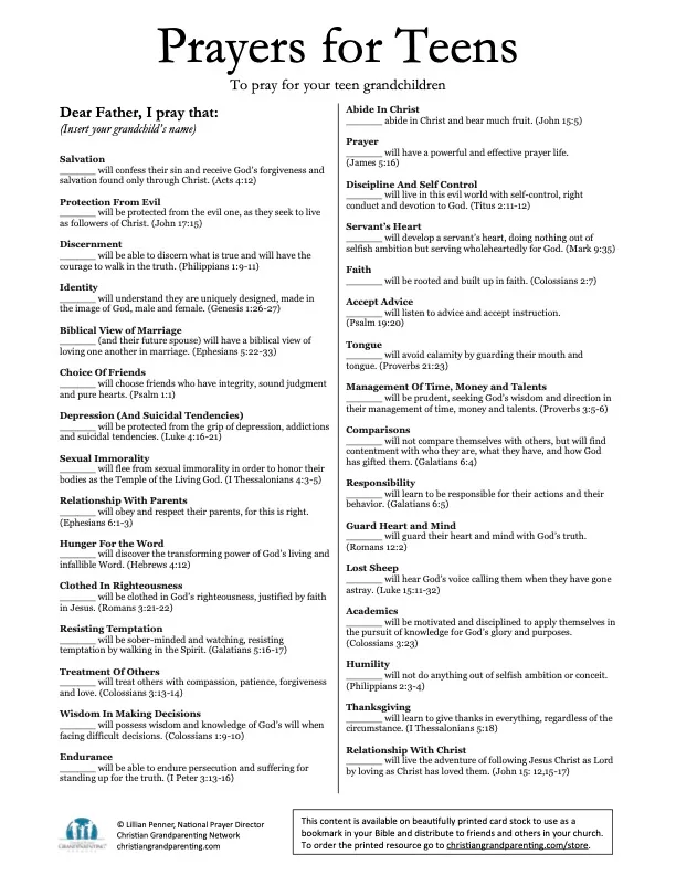 One of the most important things we can do for our teen grandchildren is to pray for them. “Scriptures to Pray for Your Teen Grandchildren” is a collection of specific, Scripture-based prompts to help you in this eternity-impacting endeavor.